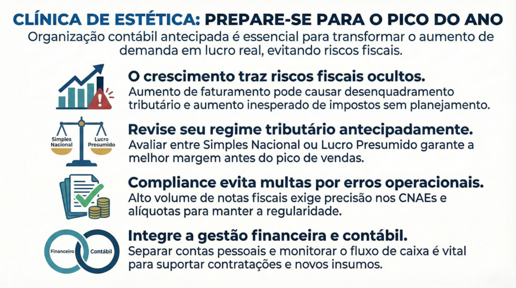 Um dos principais riscos do pico do ano é o crescimento do faturamento sem planejamento fiscal. Muitas clínicas só percebem o problema quando o imposto aumenta de forma significativa.